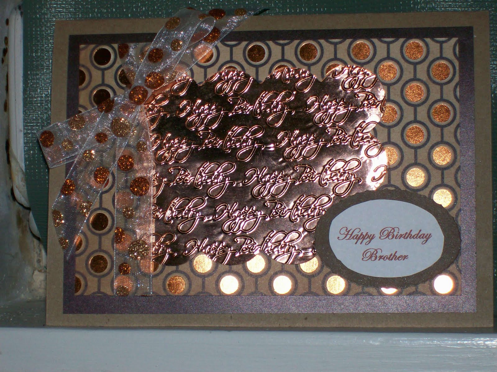 Script of Happy Birthday...I then applied it to some chocolate brown textured Coredinations and cut out a frame in Copper Polka Dots to put over it...I just happened to have some ribbon which is white organdy with copper and gold polka dots on it which was a perfect match to the paper. This was all mounted on a Kraft Cardstock 5x7 card. The inside is lined with the polka dots and a little sentiment from me to him. Hope he likes it !! Now........back to my new toy !!!