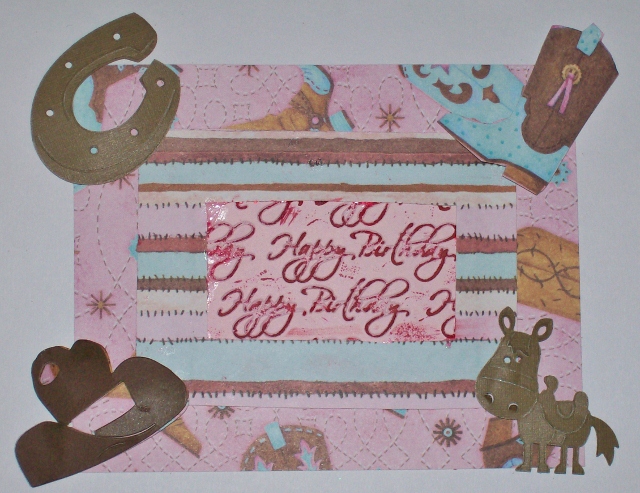 A friends is having her birthday this week and she is a horse owner, so I dreamed up a card for her using some Imagination Paper I found at Michael's and my Cuttlebug dies . It is hard to show the detailed effects of the embossed features, but the little horse, horse-shoe and cowgirl hat are all made with 2" dies on the Bug. Top photo is outside and bottom photo is inside...Stamp was also found at Michaels in the $1.00 bin ! The "Happy Birthday" inside is actually embossed on with a folder from Craft Concepts and rubbed with "raspberry" ink.