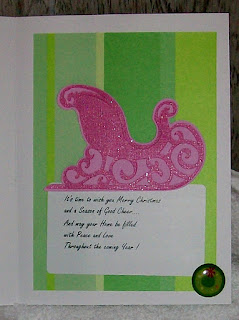 I used some textured pink (two tones) cardstock for the reindeer on the outside and also to make the Sleigh inside. The "sleigh" is the holder for the gift card inside. I layered the pink reindeer and sleigh over the designer papers, and used some foam tape for a little 3-D look to it. A little sprinkle of glitter here and there for sparkle. The paper has a "satiny" finish to it, and adds to the beauty of the design.