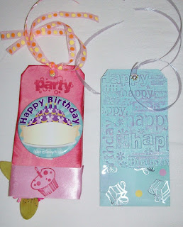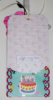 Hello My Crafty Friends ! Thank you for joining me once again. This time I have been making lots of Valentines which I will post later this week, but right now I want to give you a sneaky peek at some tags I made for a SWAP on the Cricut Message Board. We made 3 Birthday tags, one Valentine Tag, One St. Pattys' Day Tag and one Mardi Gras Tag... These were lots of fun to design and create. Sometimes I use them on gifts, and sometimes I make banners with them and hang them on ribbons. Lots of cool ways to use them ! So, here are some pics of Birthday Tags I created - I used my Cuttlebug on them a lot...~ What you will see are the fronts and backs of the tags....some tags have pocket on them to add a Gift Card in a slot. First are the Birthday tags ~