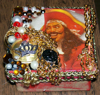 I was rummaging through boxes of stored items and ran across a "Captain Morgan Rum" coaster from a visit (who knows when or where) to a local restaurant. It was thick chipboard material with a colorful print of the Captain with a big grin on his face, staring at a bottle of his finest. "AHA"!! Instantly an idea came into my cloudy little mind. I was looking for items to make my partner on a Cricut Board Swap. It had to be Hand-Made, and I know she likes "pirates" since it is the mascot of the school where she teaches in Louisiana. I was also wanting to use a lot of Black, Red & White colors for her. So I spent about 2 hours creating a small storage box for her, using the coaster on top, and carefully used lots of embellishments to cover up the "booze bottle" and the writings on it. So, I got a chance to use up a lot of my "BURIED TREASURE" and lots of glue !! I hope you like it and especially hope that my partner will enjoy it. It will be filled with some other goodies for her .