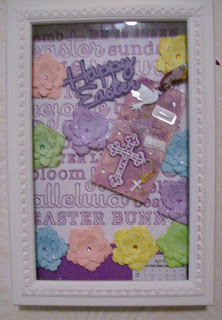 I thought I would show you my Shadow Box that I keep in my office, which has a hinged door so that I can change it frequently ( and I Do !) I added a pretty tag that I received from a SWAP partner on the Cricut Message Board, surrounded my flowers and a background printed on white cardstock, using the Cricut Phases cartridge and a purple ink pen in my Expression....cut out "Happy Easter" using the Celebrations cartridge, and a tiny April calendar in the corner with April 8 circled.
