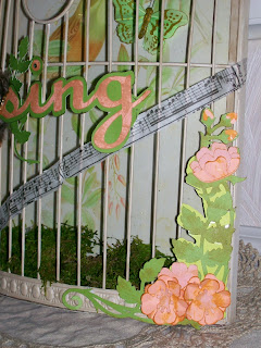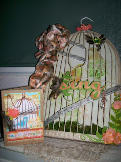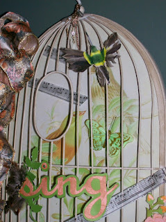 I used Cricut cartridges - Art Nouveau, Birdsong, and Imagine More Cards for the cuts to make flowers, leaves, birdcages and birds, and the word "SING" . I employed the use of some Tim Holtz Tissue Tape ( musical notes) and a few charms and ribbons.