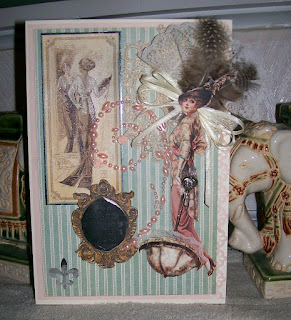 I used Graphic 45's Ladie's Diary collection....and cut out some of the details. The "mirror" was stamped and cut out in brown and then I used Spectrum Noir pens in mahogany color and black to color in a "wood frame", then I stamped another one on silver shiny paper and stamped the sentiment in the middle, then cut it out and glued inside the "wood" frame. I used silver paper as an edging for the rectangle with the lady looking in the mirror. I then sprayed her with Tattered Angels Silver Mist ( which unfortunately does not show well on camera ) to give it a little soft, sparkly, patina. Next, I cut out the lady from one the first page and removed her parasol. Then glued a lace edging to the underside of the parasol,placed several layers of foam tape under it and rounded out the shape. I used a 3" Floral stick pin with a silver charm on it and pearl to create the "handle for the parasol, and painted the shaft of it black. I then glued it to the lady's hand so it looks like she is holding the umbrella. Naturally the lady is mounted with additional foam tape over top a crocheted doily, ribbons, feathers, and a swirl of pearls and tiny roses. I used the 8"x8" papers for this card.