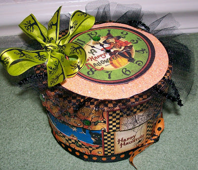 Today I will show you an altered box I made using the "HAPPY HAUNTINGS" collection from Graphic45 . I made this box to house some Halloween candy treats for my friend on the Cricut Message Board. It is layered with lots of cute G45 papers, and I added ribbons, black tulle, lots of orange glitter and some black glittery yarn pieces a a little bit of shiny "bling" for interest. Hope you will like it and I certainly hope my partner will like the box as well as what is inside !