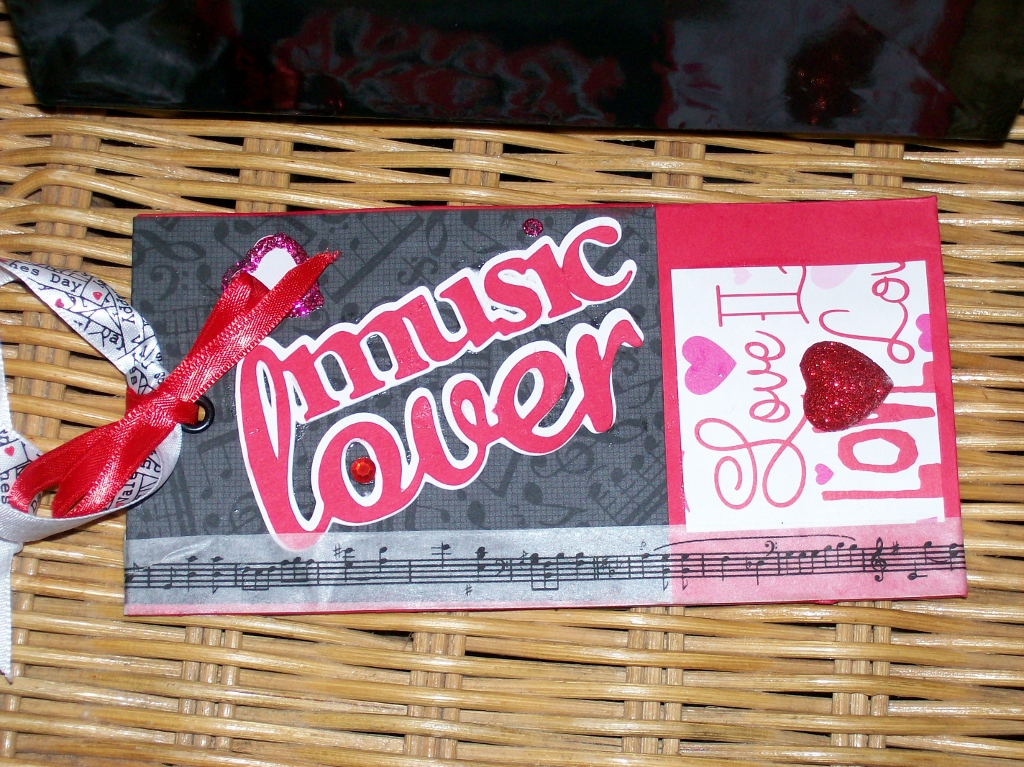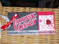 I made this Gift bag and tag set for a partner in a Cricut Message Board swap for her hubby on Valentine's Day. He is also a music lover, so I thought he would enjoy this bag with an "Old Time Rock and Roll" theme. It was made with the "Quarter Note" and the "Nifty Fifties" cartridges.