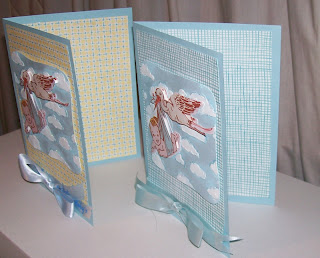 had her new baby boy this week, and I have another who is due any day now - her shower is coming up on Thursday night, so I decided to craft 2 New Baby cards at the same time, while I had the materials out. I dusted off my Imagine machine and printed/cut and layered these adorable Stork and Baby images. Then I used my Cuttlebug "Clouds" embossing folder for background textures. Added some Glitter Glue and Ribbons....not difficult. They are slightly different as you can see, but that was because I had a limited supply of appropriate ribbons...but I am happy with the results !