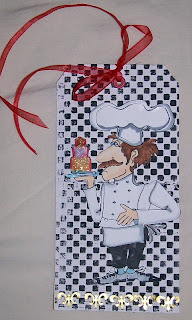 This is one of my favorite stamps from LORALIE - called "Jake the Baker" and when someone on the Cricut Message Board requested a gift bag and tag with a Baking or Cooking theme I just couldn't wait to use it for the first time ! I stamped and fussy cut a couple of "Jakes" and then colored him in with my Spectrum Noir pens...Mounted him with foam tape to a background which is a Cuttlebug 5x7 Checkered Tablecloth that was embossed on white cardstock and then I brushed it with Tuxedo Black ink , and used b/w checked ribbon for the bow, and a "fleur de lis" punched border on a rectangle of textured gold cardstock served as the carrier for the sentiment stamp...." You deSERVE it..." as Jake Serves up a piece of cake !