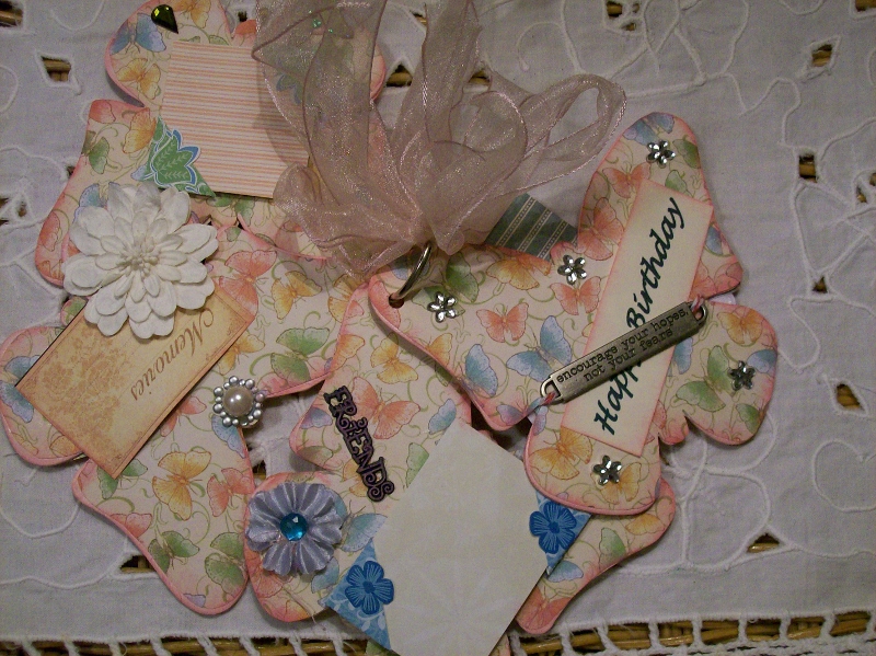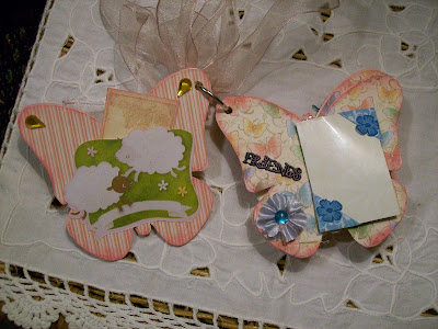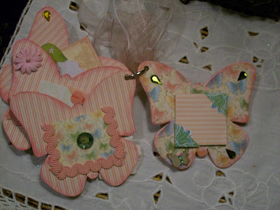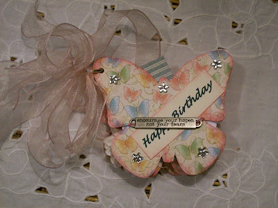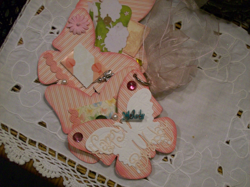 Just wanted to share a mini-album that I made for a friend's birthday...I used a Butterfly shaped chip board album that I got in the Bargain bin at Michael's and covered the pages with paper from the "Little Darlings" collection of Graphic 45. I just fell in love with their butterfly printed paper and the coordinating stripe. I also used a few bits from the "Ladies Diary"collection in the embellishments...Lots of pink ink from Martha Stewart ink pad, TH metal, bling from everywhere. Her name inked out on Shrink film and "shrunk" to charm size that I attached to a letter-pressed butterfly from my Fiskars Fuse along with die cut "Happy Birthday" that is coated with Glossy Accents.
