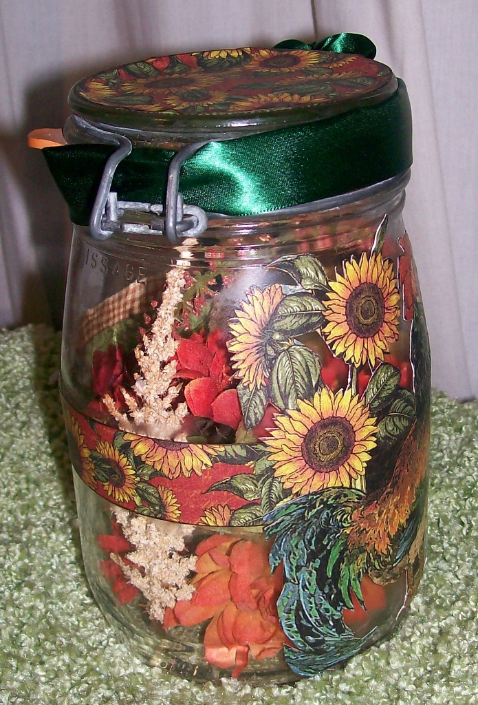 I found a hinged lid, French canning jar that I had stashed away and decided that it needed a genuine French look to it, so I pulled out my "FRENCH COUNTRY" Graphic 45 paper pad and went to work. I first cut a 1" border strip to glue around the center belly of the jar. Then, I fussy cut the Rooster and Sunflowers out, and decoupaged them onto the glass . I also added a small matching sentiment from the collection on the back side. I added a circle to the top of the lid that matches the border design. Lastly, I filled the container with bright Fall flowers and added a forest green ribbon and some bling...
