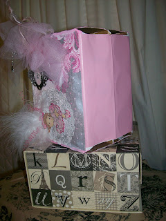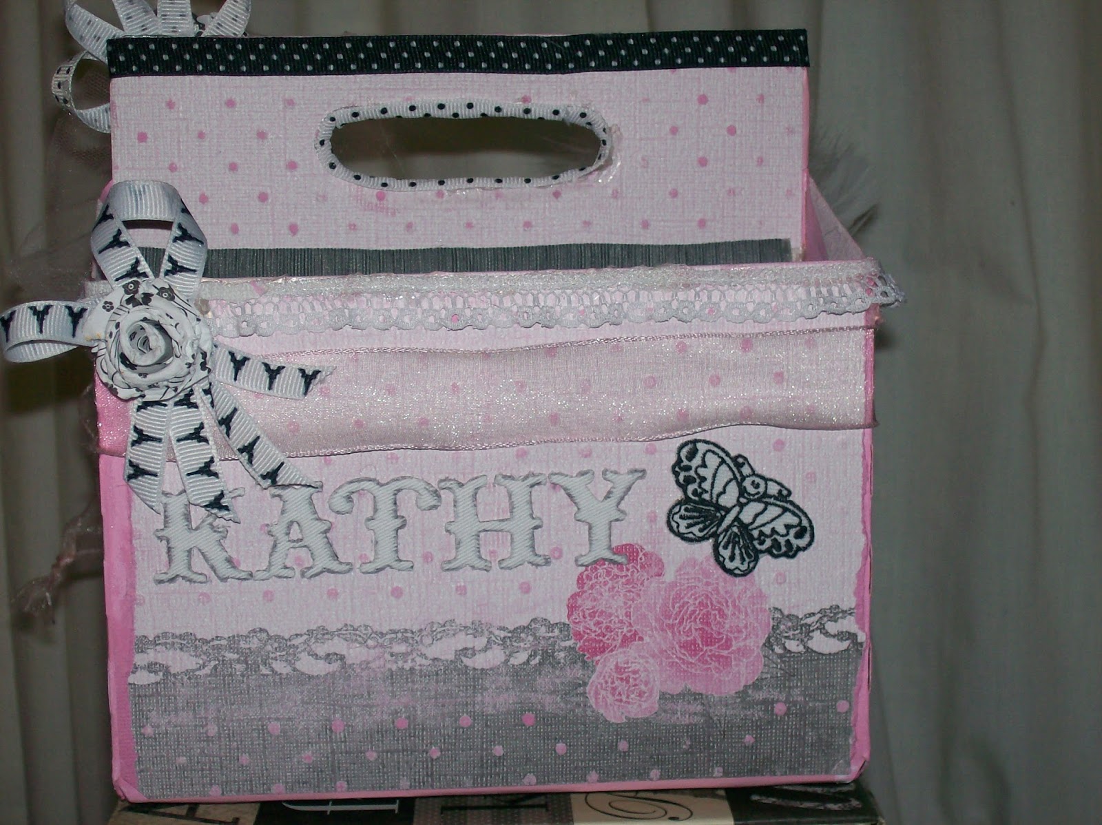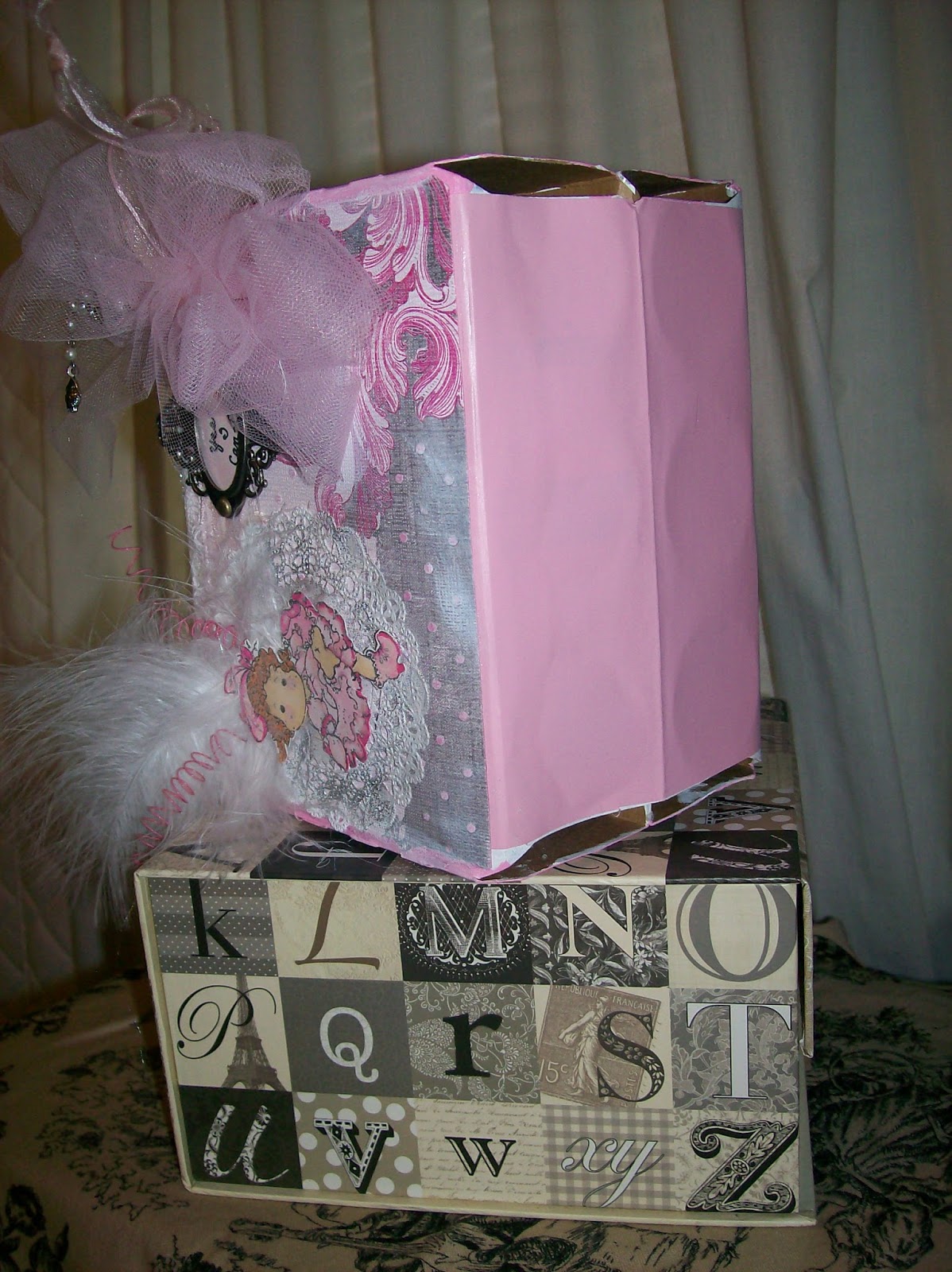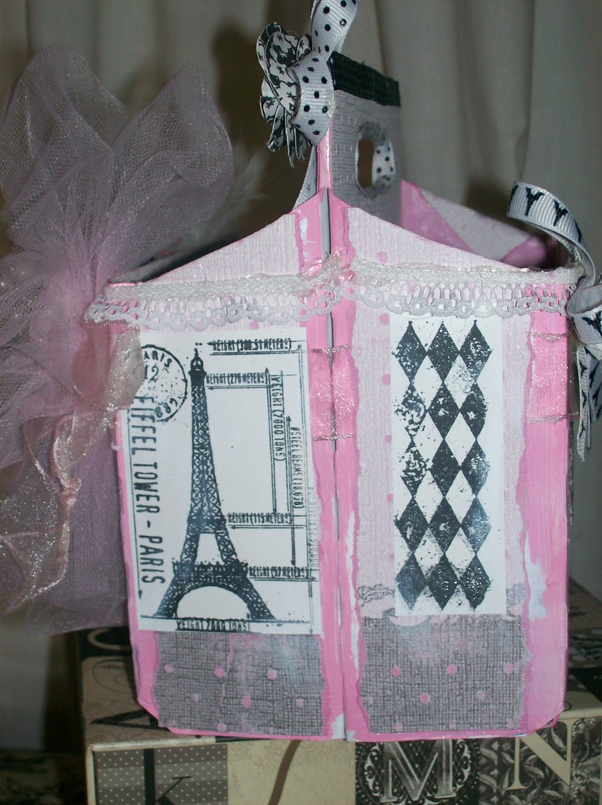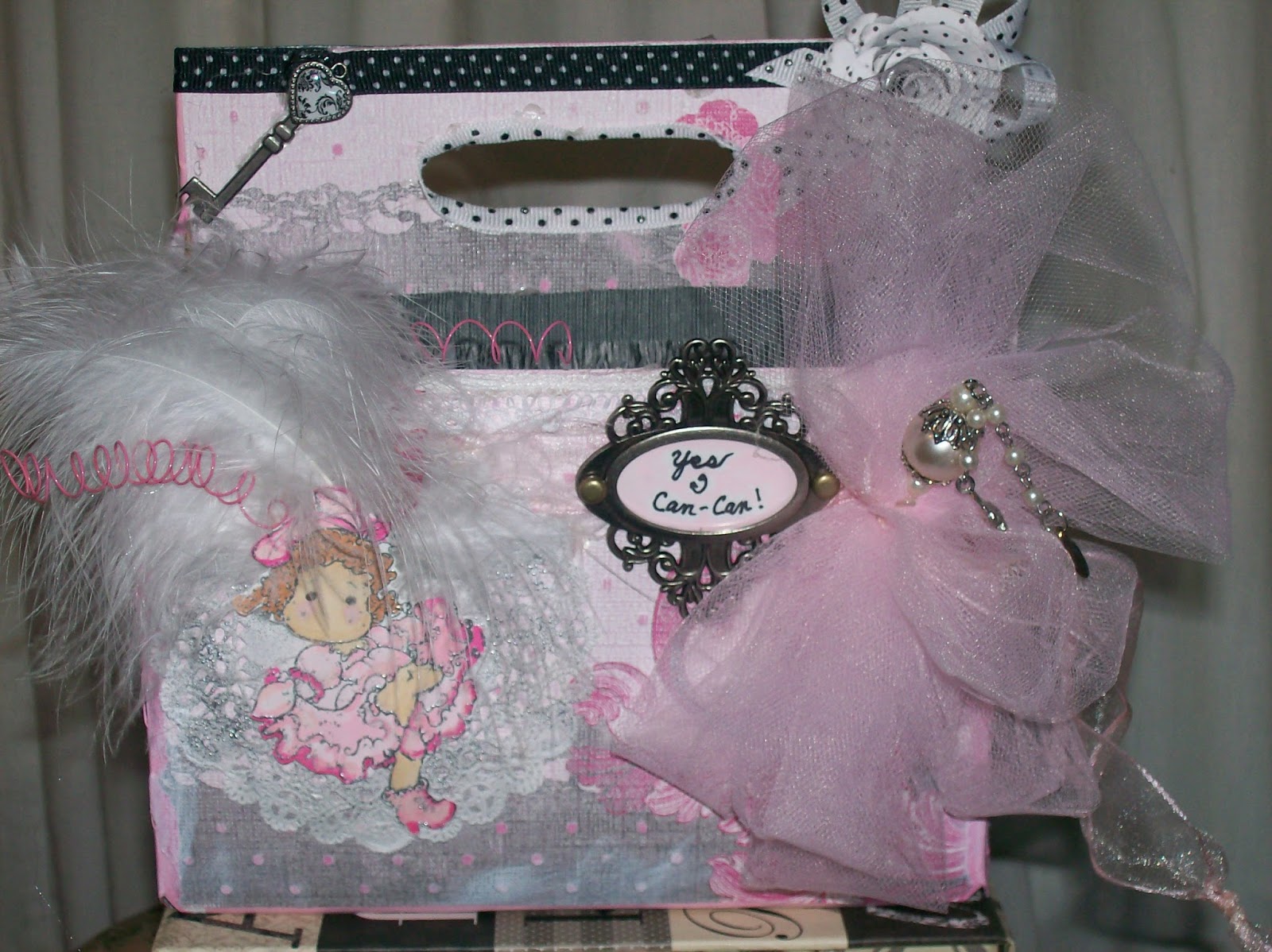 I found some grosgrain ribbons in black/white dots and glued to the top and around the inside of the carrying slot. I found a really cute key for the front and I made b/w dotted paper flowers for it and added them along with the pink tulle bow, some white feathers, pink wire swirls, and a stick pin that had pearls and crystals that I made as well. I then decided that it would be appropriate to add the sentiment "Yes, I Can-Can" to a piece of cardstock and encase it into a very ornate metal tag on the front.