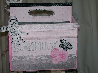 the Eiffel Tower. On the back of the carrier, I added the recipient's name in fabric covered letters on chipboard and a cute little embroidered fabric butterfly .