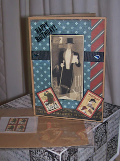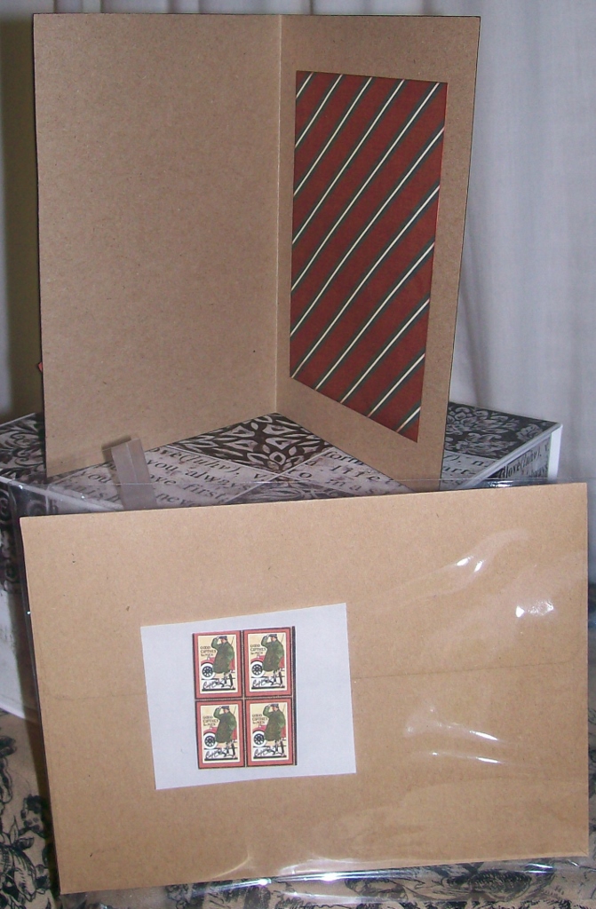 Here is a card I recently completed using Graphic 45 " A Proper Gentleman" cardstock. It is of course, distinctly masculine and I love how the papers remind you of a nice silk neck-tie on a well-dressed man ! I add some brads that were tear-drop shaped and had a blue rhinestone in the center of each one. I thought they looked like nice "tie tacs"...like my Dad used to wear. Also I love the masculinity of using Grosgrain ribbon on the background. Added some small snippets from the paper collection that are mounted on black cardstock and mounted with foam tape for dimension. Inside the card I added a mat in matching cardstock, and then I cut a few of the "stamps" form the collection papers and ran them through my XYRON "Creat-A-Sticker" machine and made a Seal to place in with the envelope as a nice way to complete the card-making process. I always package my cards that I sell or swap in a cello bag to keep them nice and clean and crisp for the giver !