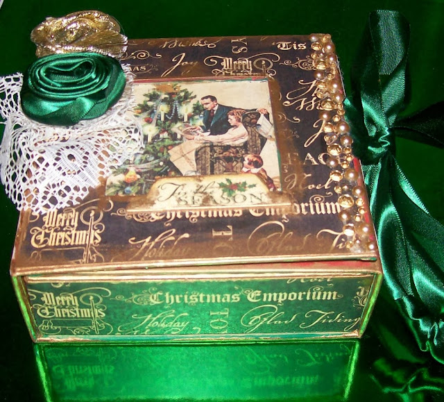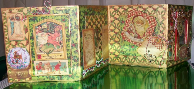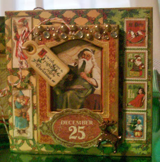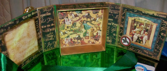 " Christmas Emporium " from Graphic 45 is one of my all time favorites and I just had to make a "Mini-Album in a Box" for my partner on the Cricut Message Board this year using those papers. Here is a collection of photos of the box and album which I just finished making. It was a lot of fun to make and I hope she will like it because I hated to part with it !!