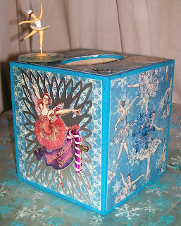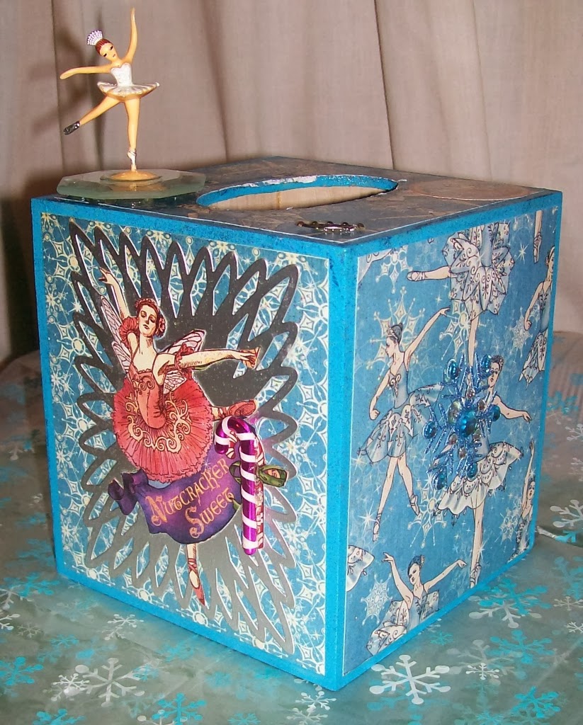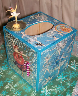 So far I have managed to make 3 types of cookies, pecan bark, and a batch of homemade pumpkin butter which has to go in sterilized jars and sealed and then decorate the jars and tie them up in cellophane bags and get them delivered !! Well, somehow I managed to get some crafting done as well... I will keep this short and just show you a Tissue Box holder that I made for a gift for a little girl with Graphic 45 Nutcracker Sweet papers....featuring the blue ballerina and snowflake designs of the Snow Queen... with a vintage ballerina on top that I mounted on a small mirror in one corner... Just maybe I can get time to show you some more later this week ! Happy Holidays !