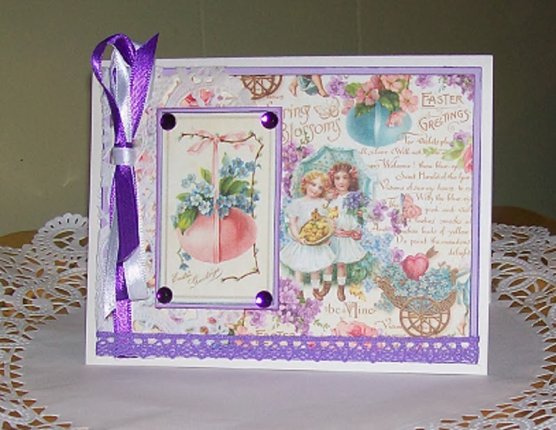 So, in honor of the impending Spring season ... I made a few Easter and Springtime cards today for a Cricut Swap. Using the Graphic 45 "Sweet Sentiments" collection I was able to make several cards from just 2 pages of card stock and some embellishments that I have had stashed away for a long time. I will be making a whole lot more of these and no 2 will be alike...these were all relatively simple, but I have plans to get out the Cuttlebug machine and some of those new Anna Griffin Dies tomorrow, so stay tuned in for the more complex versions !