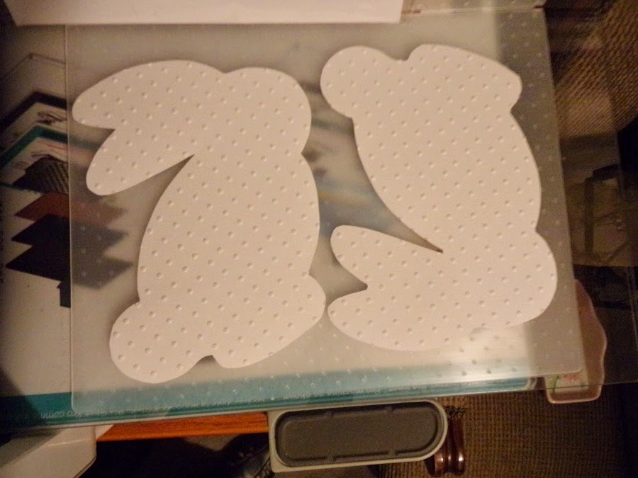 I wanted to show you the pictures from the beginning on this, and how I found these 8 1/2" x 11" Embossing folders from EBOSSER to be so handy at being able to emboss the entire "bunny" all at one time - in fact I could emboss TWO bunnies at a time !! See the last 3 photos !! :>)