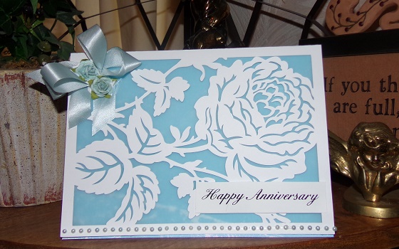 Today I want to share an Anniversary card I made for my In-Laws.... I used Anna Griffin's Garden Cards cartridge for the front and base... Inside is lined with light blue vellum. Sentiment inside was printed with the Explore machine (part of the card on the cartridge) using light blue Cricut Pen. Also I added the "Grateful for You" which is an Anna Griffin premade sentiment on Vellum from her Treasure Chest collection. Happy Anniversary sentiment Tag was printed on my laser printer and then put through the new Anna Griffin MINC foiling machine with blue foil....it worked perfectly ! Flowers are Prima. Pearls are Basic Grey baby blue. Size of the card is 5x7 (my fave)